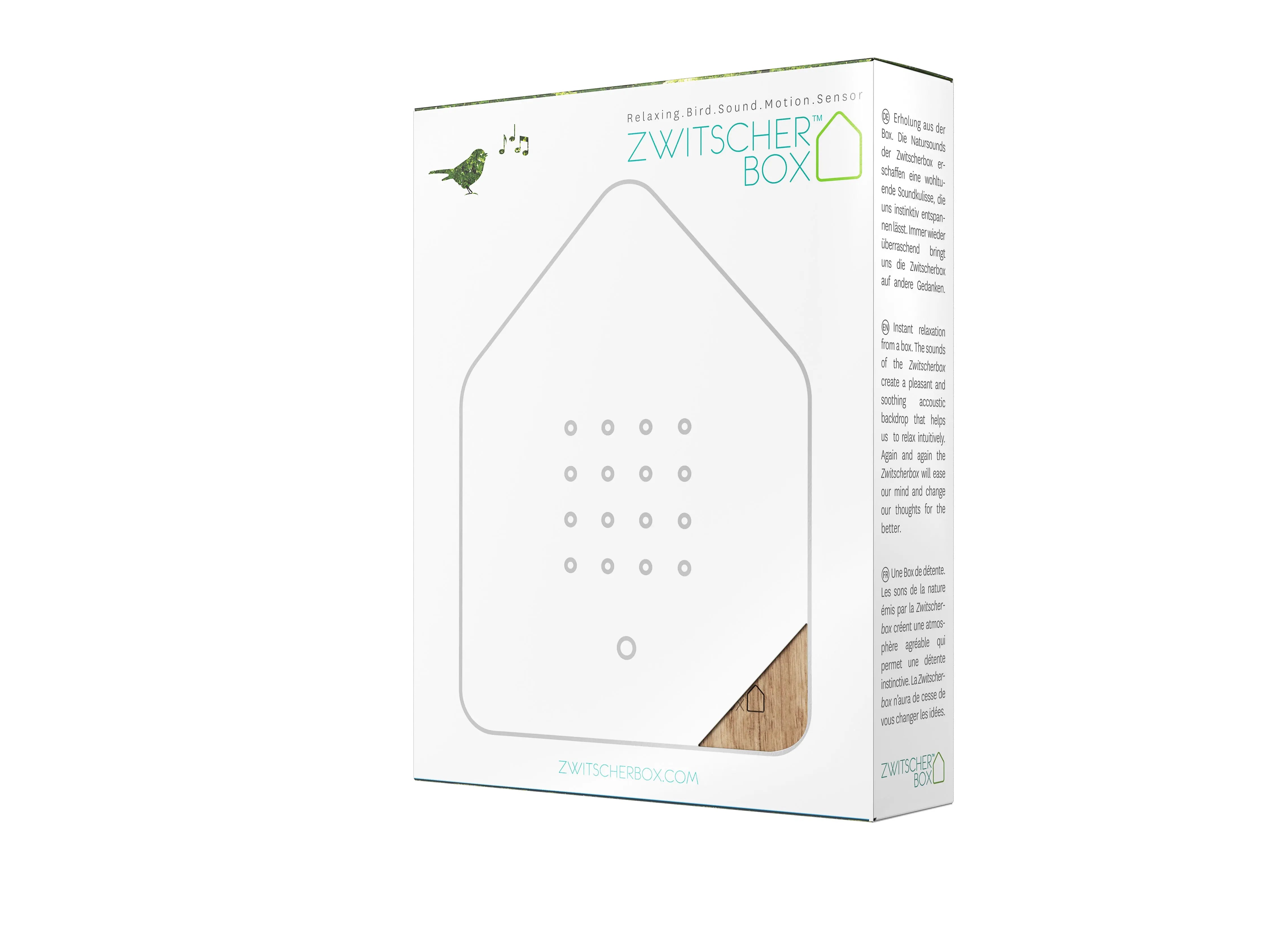 The Zwitscherbox: As refreshing as going for a walk Our Relaxound Zwitscherbox gives you precious moments of relaxation. Soothing nature sounds let you walk through a morning forest: The cheerful chirping of blackbirds and other songbirds immediately calms. You feel how your head and body intuitively relax and become cleared.
